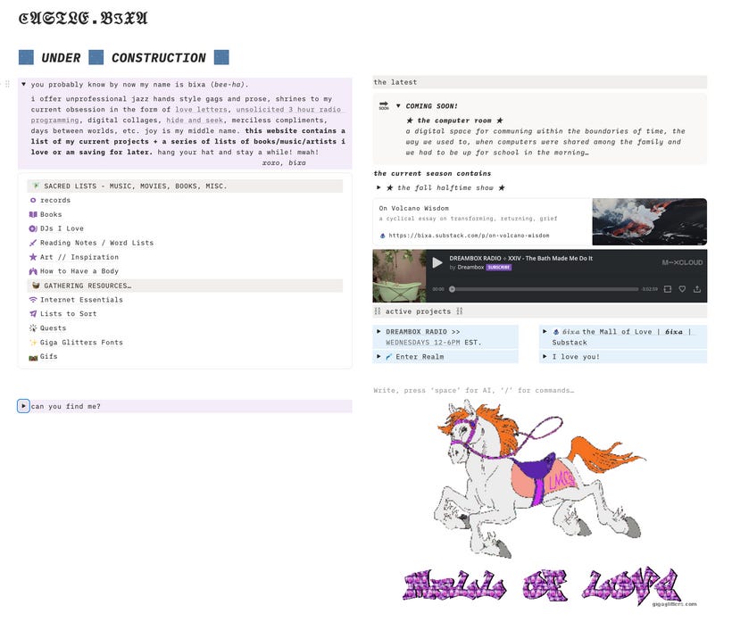 ★★★★★★ Expanding my digital castle-grounds, including a home-base for me projects and updates. This page includes several databases where I am organizing lists of books, albums, radio shows, and other resources i have loved and use to survive this weird fucking world. it is very in progress. inspired by the notion-worlds of Cody Cook Parrot and Chloe Almeda.